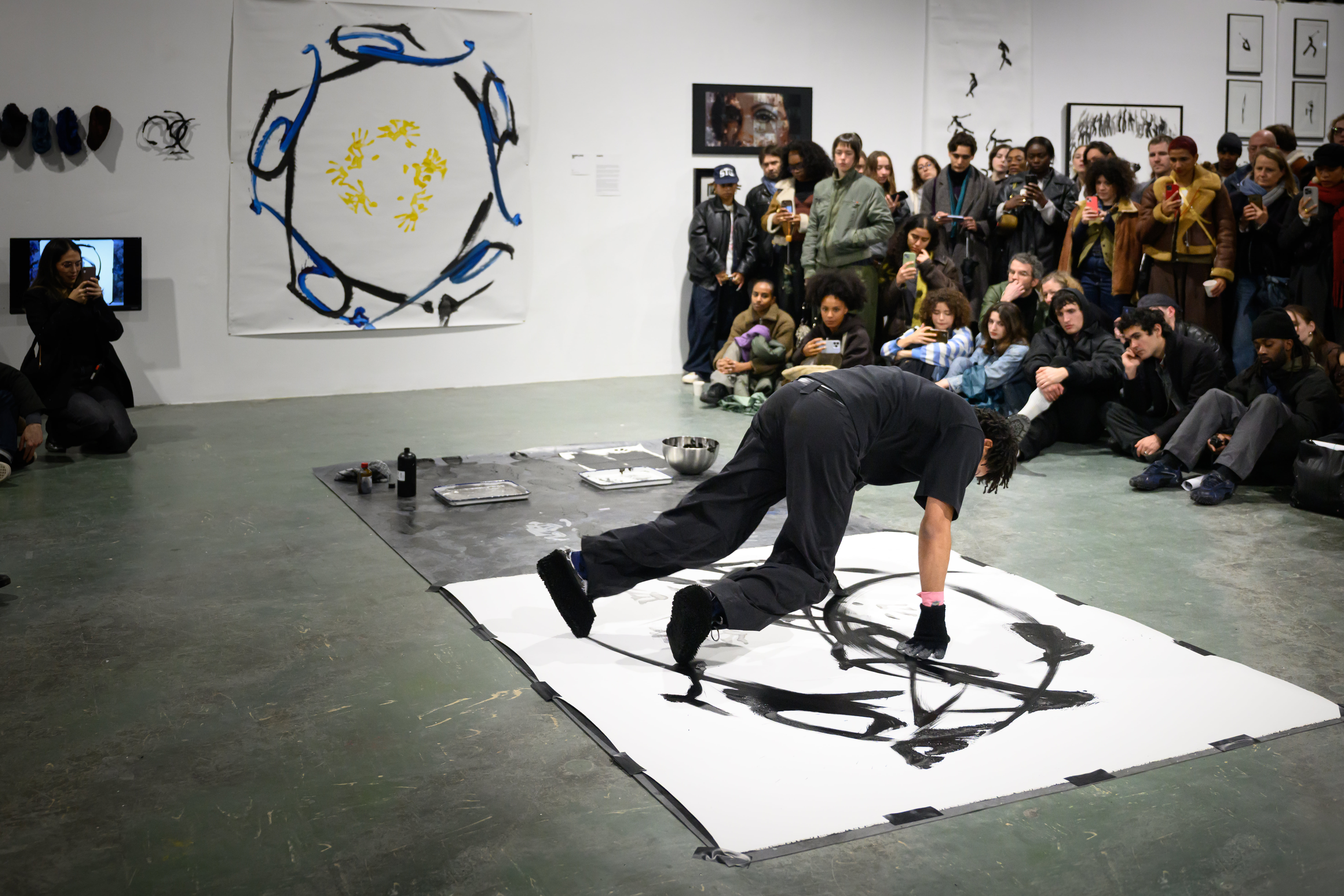 À la manière d’un.e calligraphe, j'exécute mes mouvements sur la toile ou le papier au sol, après avoir baigné mes chaussures et mes gants dans l’encre. Les formes dessinées par le frottement de mon corps en mouvement ressemblent à des lettres. De cette gestuelle naît un système graphique, sorte d’alphabet visuel, avec une logique et un répertoire de formes qui m'est propre. Mon travail se manifeste alors sous deux dimensions indissociables : l'œuvre plastique et la performance physique du corps.